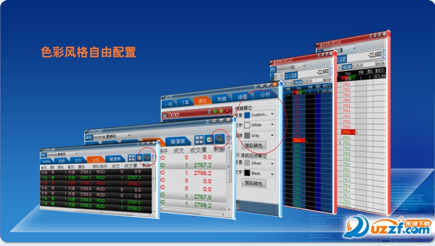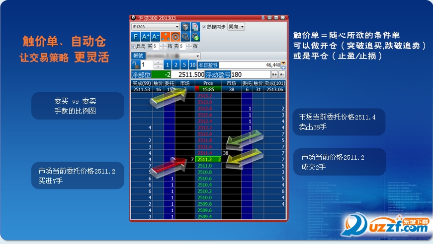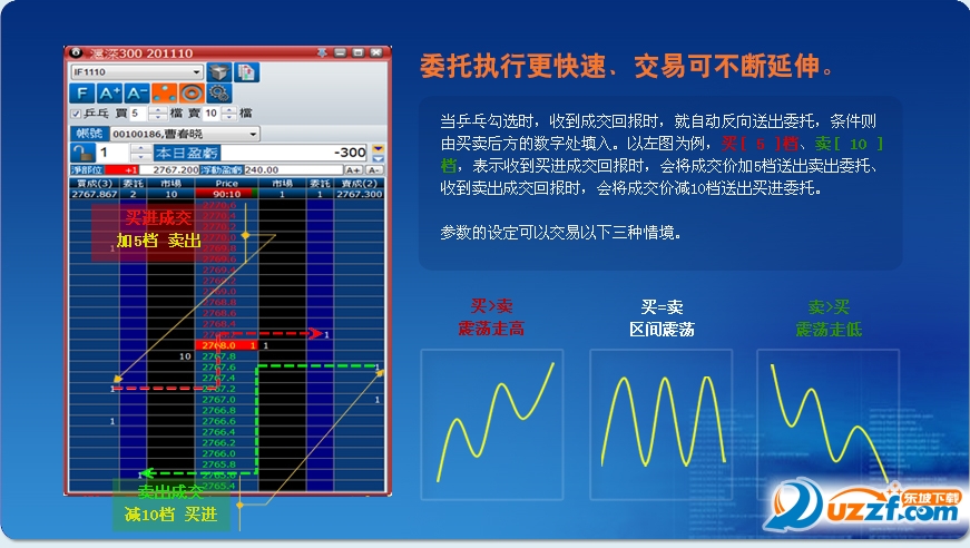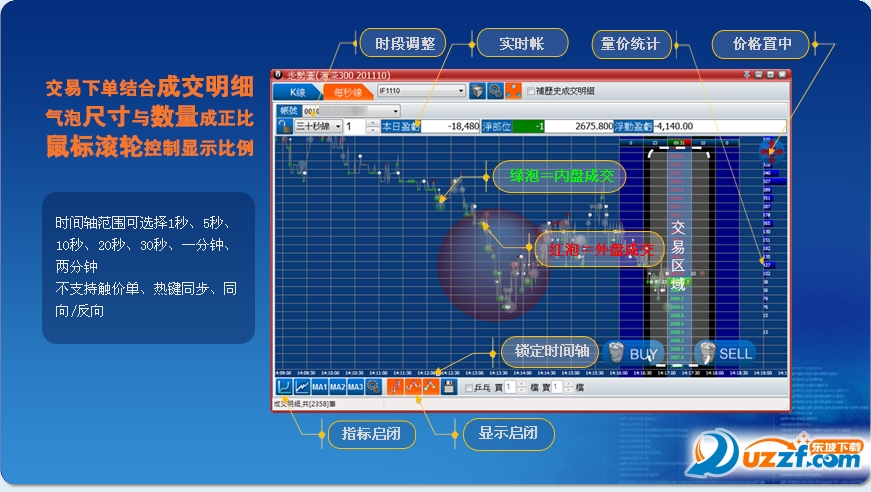 独家提供将走势图与交易画面迭加的创新功能,以气泡尺寸大小模拟成交量,红色气泡表示成交价大于等于卖一价(买盘主动成交),绿色气泡表示成交价小于等于买一价(卖盘主动成交),白色气泡表示成交价介于买一价与卖一价之间,最多可开启三组。