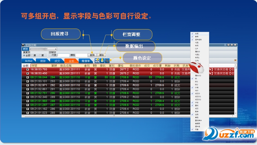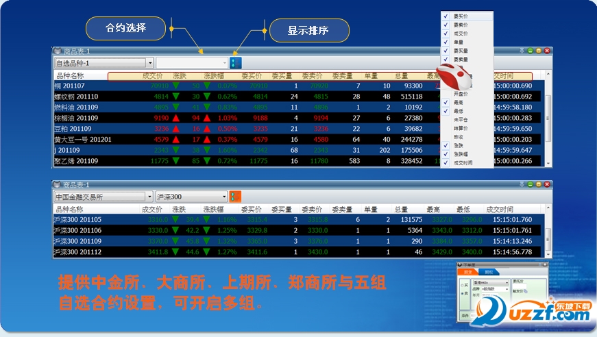 行情表上缘字段处,点击鼠标左键,可增减显示栏目,并可自行移动排列位置。