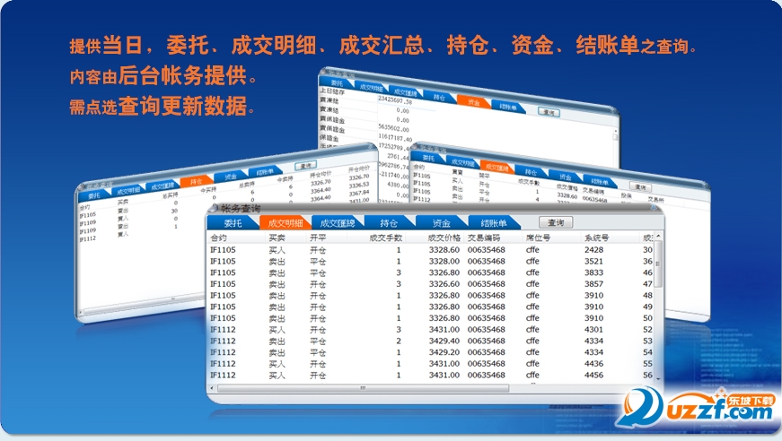 提供当日,委托、成交明细、成交汇总、持仓、资金、结账单之查询。