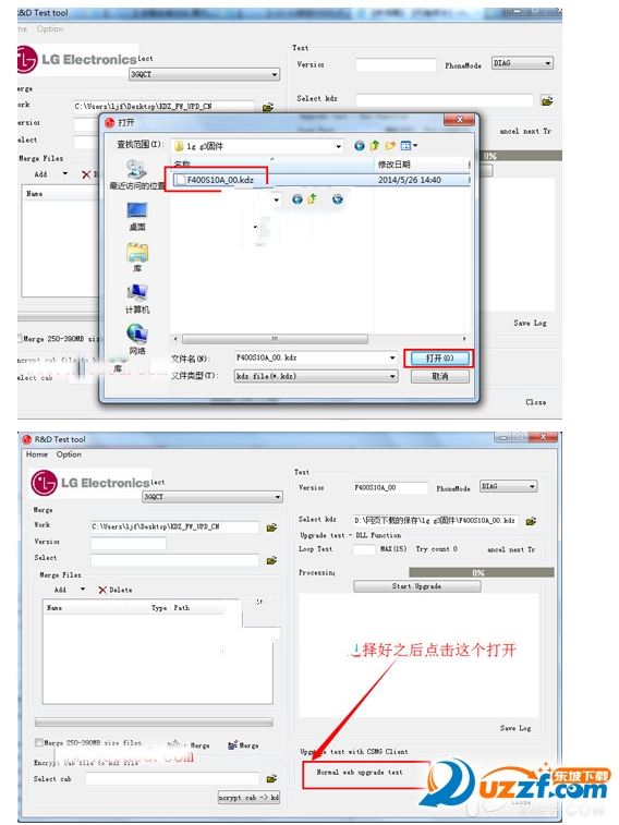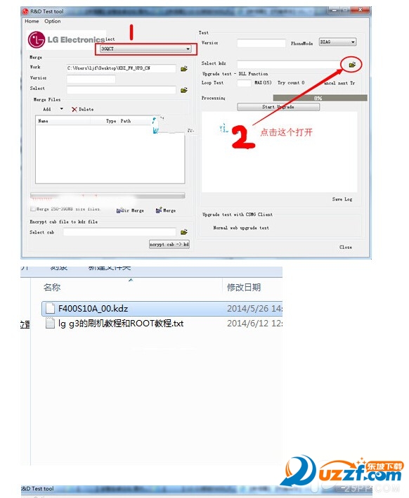 第四步,然后在解压出来的文件夹里找到【UpTestEX.exe】文件双击打开,打开较慢,需要等一会儿,打开后,选择你刚才下载下来并解压出来的KDZ包。