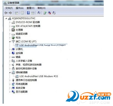 第二步,然后打开电脑的设备管理器,COM端口出现LG开头的一项后,方可进行下面步骤,如果没有显示,说明手机连接有问题或者驱动有问题,请检查。
