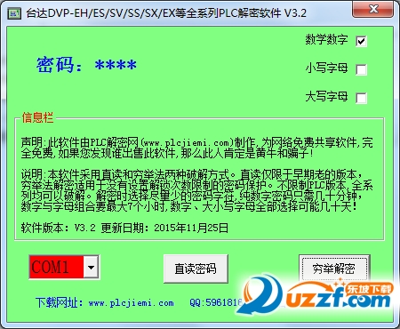 本软件默认串口号为COM1,通讯设置为9600,e,7,1,由于采用穷举法解密,所以可能需要很长时间,最好能尽量少的选择密码字符,纯数字要30分钟左右,字母加数字要几小时,全部字符全选则要几十天。高版本的4位以上的密码可能无法破解。