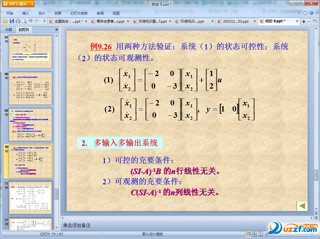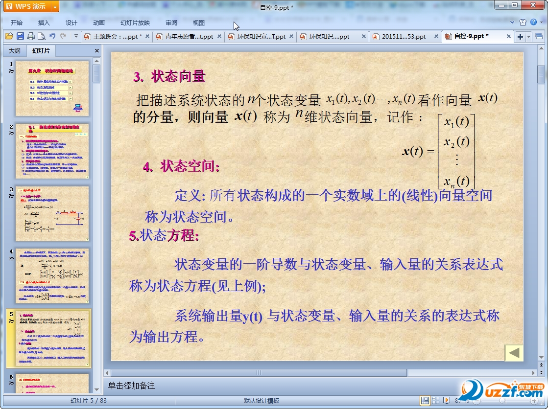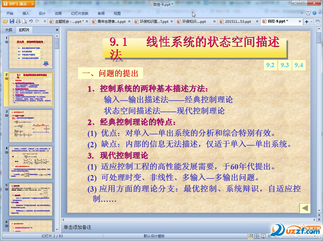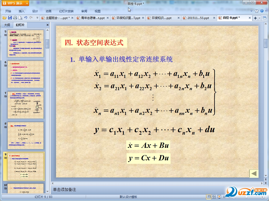 这是我们东坡下载为大家带来的一篇状态空间描述法课件(自动控制原理第九章),该课件共有83也内容丰富完整,有需要准备自动控制原理课件老师们可以来我们这里免费的下载使用!