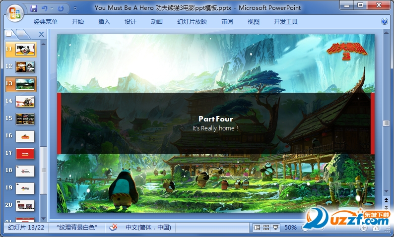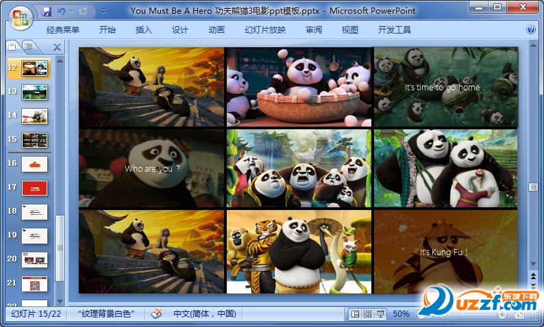 《功夫熊猫3》是同名动画的第3部电影作品了,恰到好处的煽情,一如既往的欢乐,剧情励志大人小孩都能看的合家欢片,这里分享的是功夫熊猫3电影介绍ppt,英文ppt模板,喜欢功夫熊猫的朋友千万不要错过了。