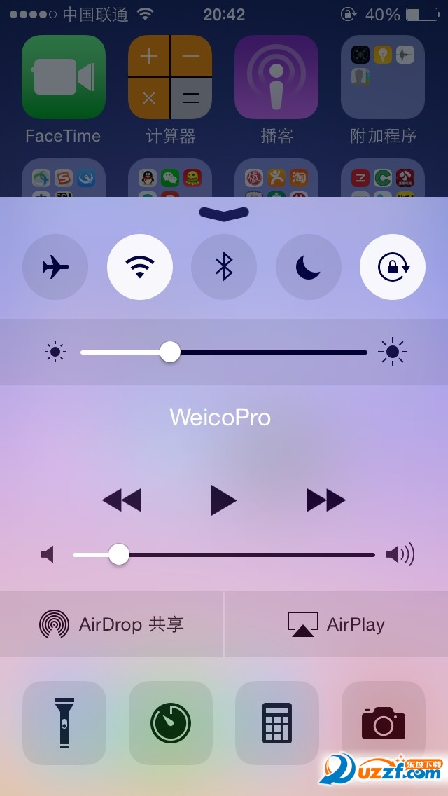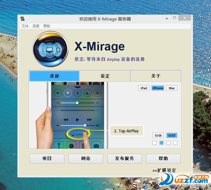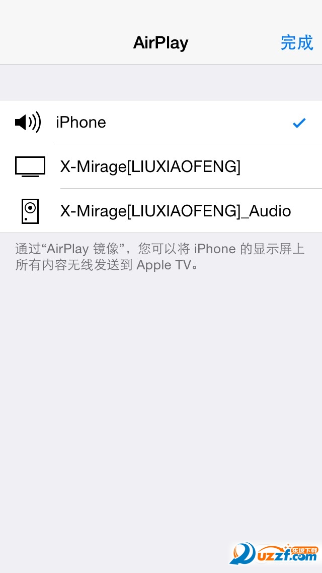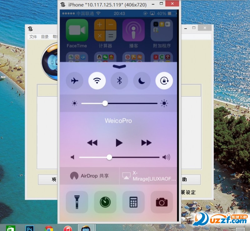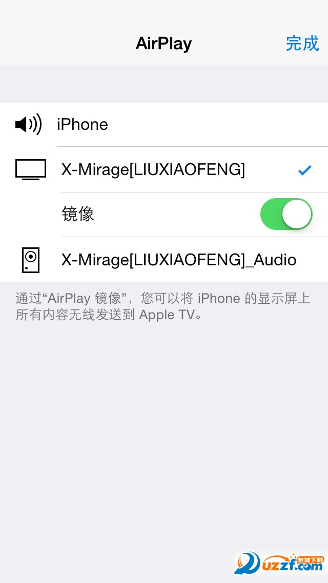 第四步:在 iOS 设备中打开 AirPlay,在 iOS 7/8 中,划出底部控制中心,在 AirDrop 中选择 X-Mirage 所设定的 AirPlay 服务器,勾选镜像。