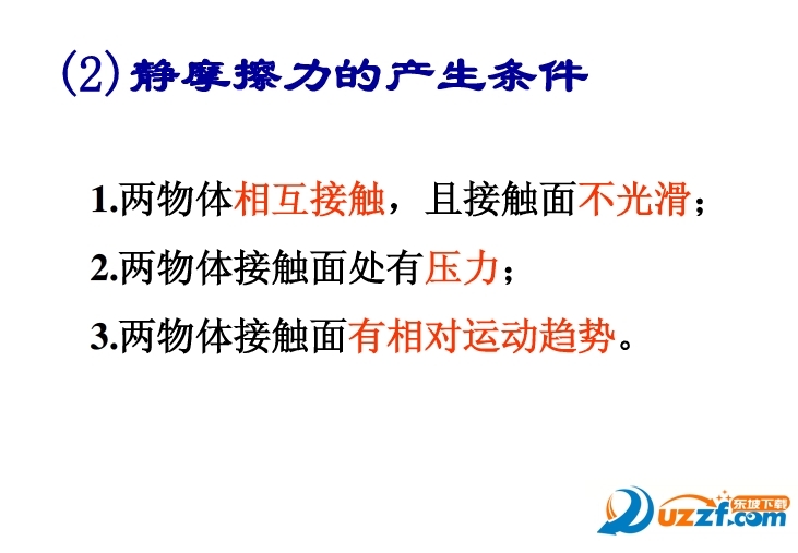 1、先利用“条件法”(产生摩擦力的条件是:①两个物体相互接触,②两物体的接触面之间存在弹力,③接触面不光滑,④两物体间有相对运动或相对运动的趋势.)、“假设法”等方法判定摩擦力是否存在.若两物体间存在摩擦力,则: