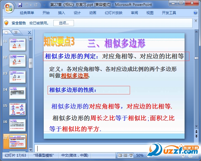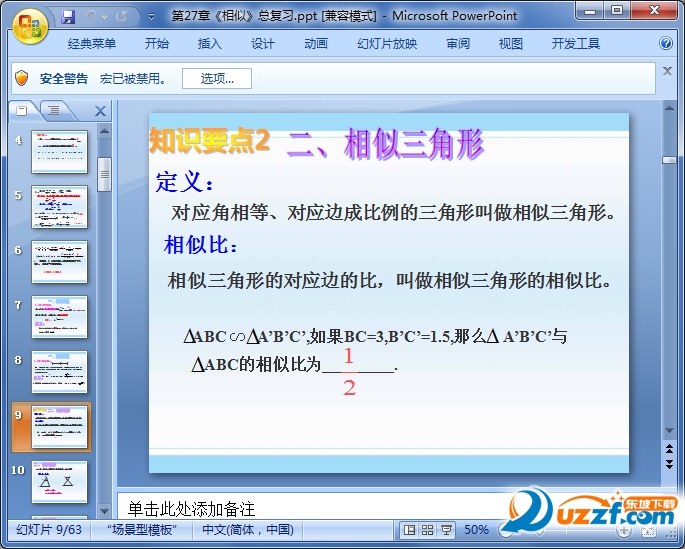 东坡小编这里分享九年级数学下册第27章相似复习课件,理解相似图形的性质与判定、位似的性质与把一个图形放大或缩小,在同一坐标系 下感受位似变换后点的坐标的变化规律。