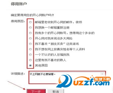 在停用账号里,选择停用理由,还有相应的描述,按【下一步】。