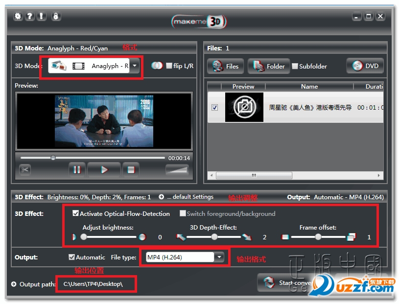 选择好类型之后没,接下来MakeMe3D为用户提供了效果调整的功能,调整的强度可以通过预览窗口来观察,接下来在主窗口的下方设置输出3D电影的视频格式,MakeMe3D提供四种视频格式进行输出,可根据个人的需要来选择。