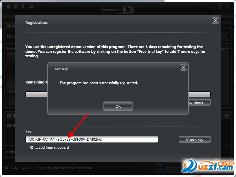 安装成功后,打开MakeMe3D的第一步就是提示你需要注册激活,注册码小编已经附在特别说明里了,粘贴上去点击[Check key]即可。