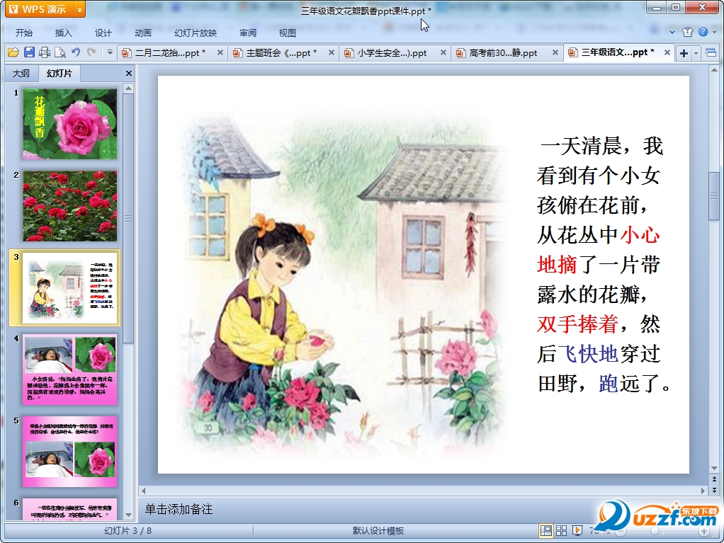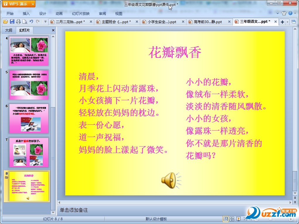 这是一篇小学三年级语文花瓣飘香ppt课件,整篇ppt共有8页制作十分精美,老师们如果需要这篇共8页的花瓣飘香ppt课件可以来我们东坡免费的下载使用!