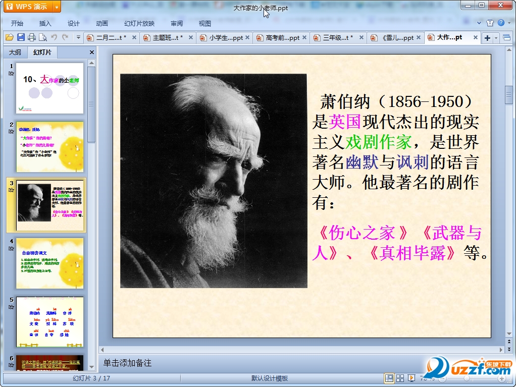 3.课文中有写作专长的大作家叫萧伯纳。(出示萧伯纳的简介)生读,你从中知道了什么?(板书:萧伯纳)