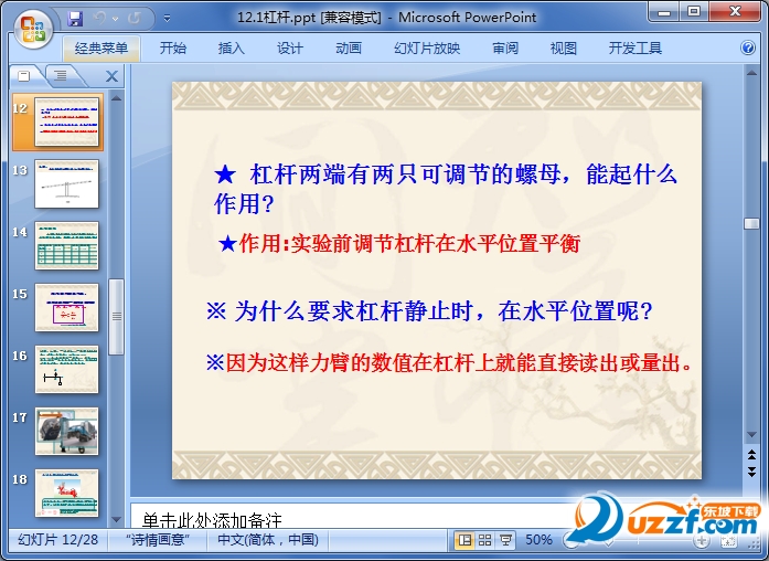1、杠杆是既功、功率的学习后,引入的一种重要的机械,为以后学习滑轮、斜面等机械的知识打好基础,对学生分析实验以及解决实际问题的能力的培养有很大帮助。