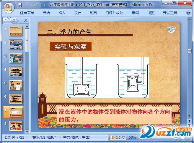 10.1浮力这节内容以密度、力、二力平衡等知识为基础,在综合应用液体的压强、压力、二力平衡等知识的基础上展开的,八年级物理下册浮力课件ppt是该课的配套资源,需要的朋友可以免费下载。