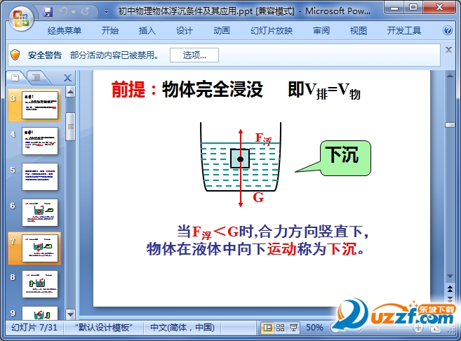 当F浮<G时,合力方向竖直下,物体在液体中向下运动称为下沉。