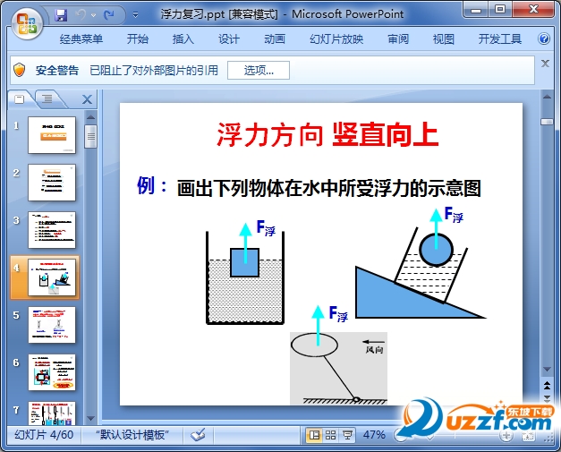 斜面上的物体受到的重力和浮力示意图(理解浮力的方向),画船漂浮在长江和大海里手里示意图(为了引入力的平衡),学生训练画力的示意图,其中包括了密度计和潜水艇,为力的平衡及浮力大小分析做好铺垫。