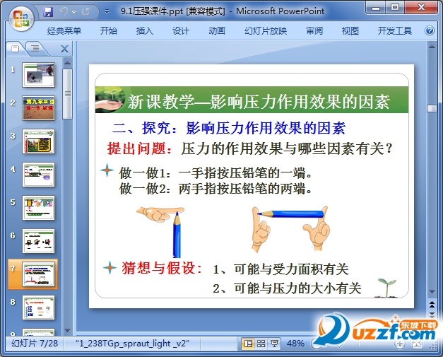 2、鼓励学生利用身边物体积极大胆地参与科学探究,关注学生的学习兴趣。在探究压力的作用效果和总结增大、减小压强的办法时,让学生利用身边物体获得亲身体验后发现问题,再利用身边物体解决问题。这是后进生的强项,可使他们充分展示自己的才能,增强他们的自信心,激发学习斗志。