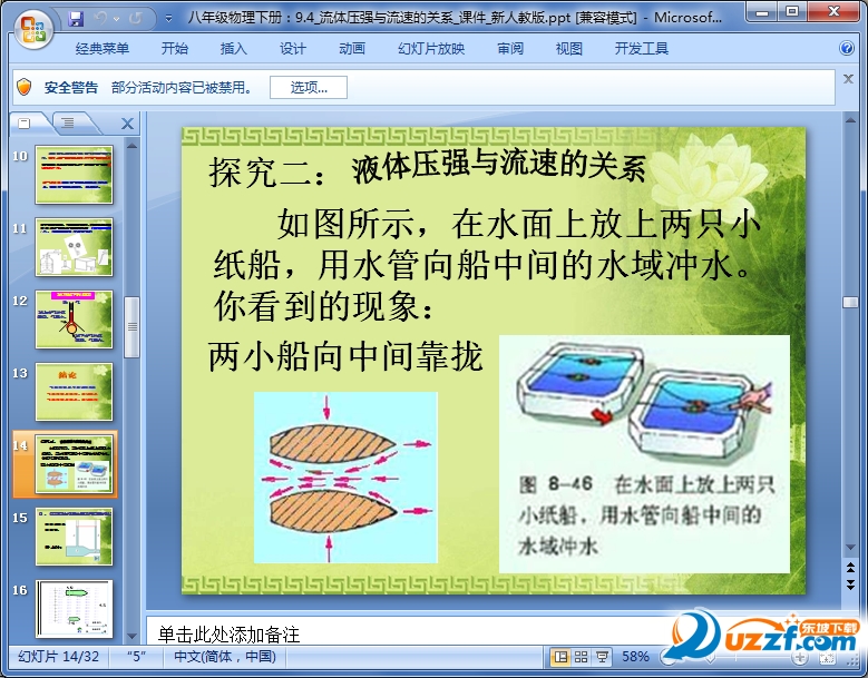 流体压强与流速的关系这节课是科学探究实验课,以学生实验探究为主,通过探究实验体验流体压强与流速的关系,加强学生的动手实践能力,流体压强与流速的关系ppt课件通过对流体压强与流速的关系的认识,解释飞机升力的产生,并解释相关现象。