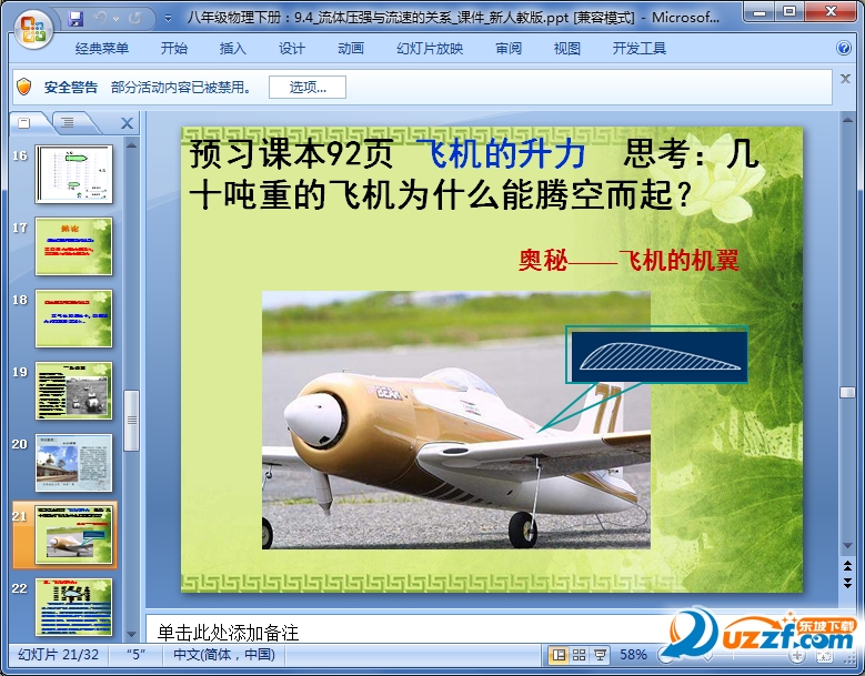 预习课本92页 飞机的升力 思考:几十吨重的飞机为什么能腾空而起?