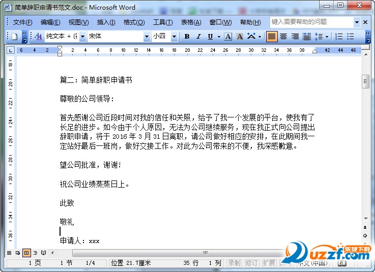 又到开年了,新的一年是不是想要换一份新的工作,找一个新的环境,想要辞职的话,要写一份简短但是意思表达的非常清晰的辞职申请范文,可以参考一下东坡小编带来的这7篇简单辞职申请书范文,非常的经典、简短、表达清晰。