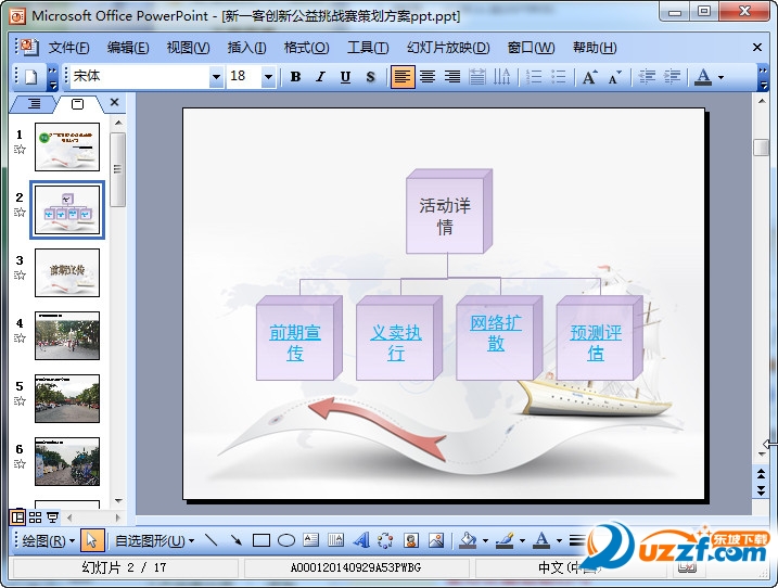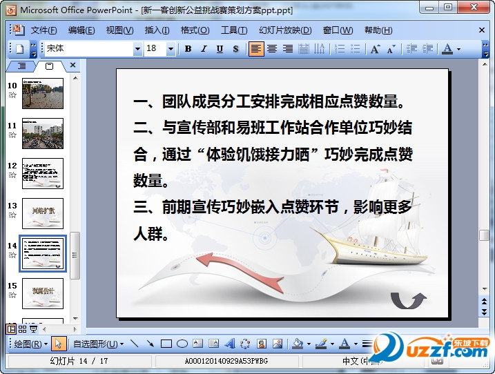 新一客创新公益挑战赛策划方案ppt,一份完美的ppt课件,总共有17页,策划活动方案中提到了,前期宣传、义卖执行、网络扩散、预测评估等几个方面,并且进行了详细的数字、图表说明。欢迎有需要的朋友前来东坡下载使用。