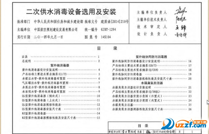 14S104二次供水消毒设备选用及安装图集,一份用来替代02SS104的建筑图集规范,符合国家标准规定。pdf格式的,需要用专门的pdf阅读器来打开,你只要直接点击下方的相应的下载地址,就可以免费收入囊中啦。