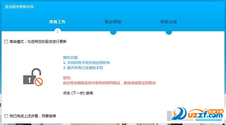 小白用户可按提示进行操作。安装驱动前请关闭所有不相关的应用软件,以免冲突。同时断开已连接手机,避免安装后需要重启。完成以上步骤,请在“我已完成以上步骤,同意继续”中打勾,然后点击“下一步”。