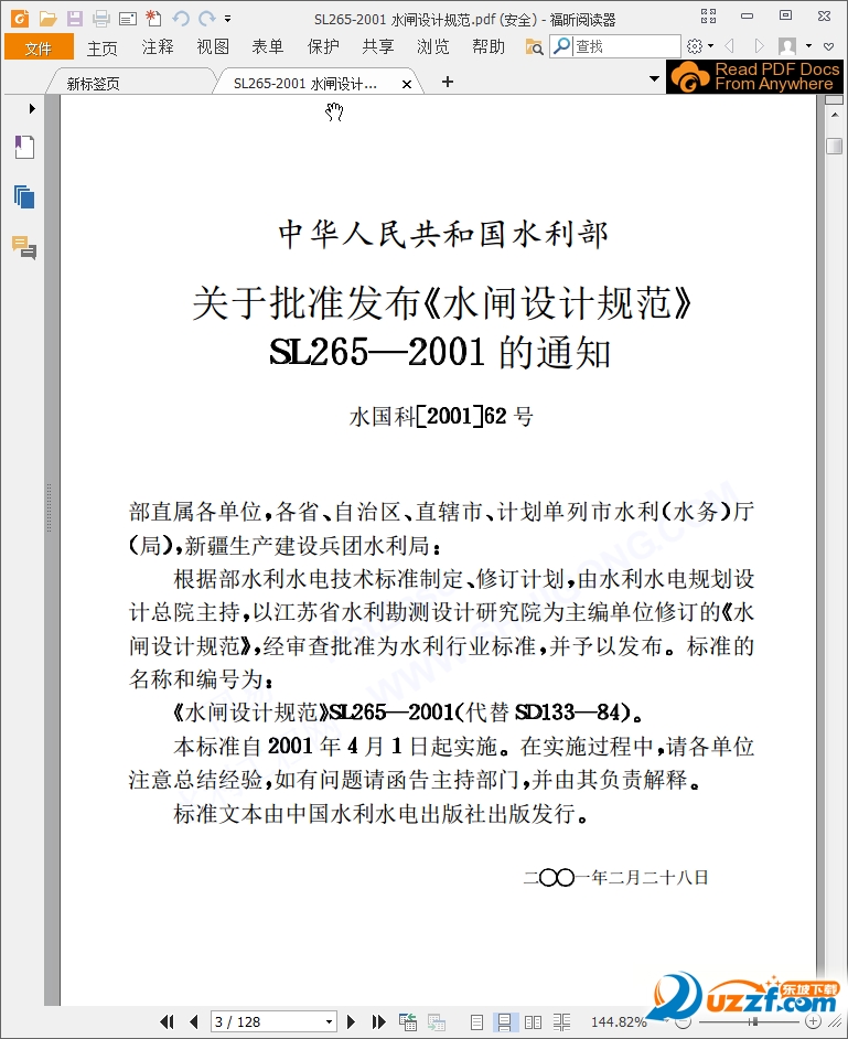根据部水利水电技术标准制定、修订计划,由水利水电规划设计总院主持,以江苏省水利勘测设计研究院为主编单位修订的《水闸设计规范》,经审查批准为水利行业标准,并予以发布。标准的名称和编号为: