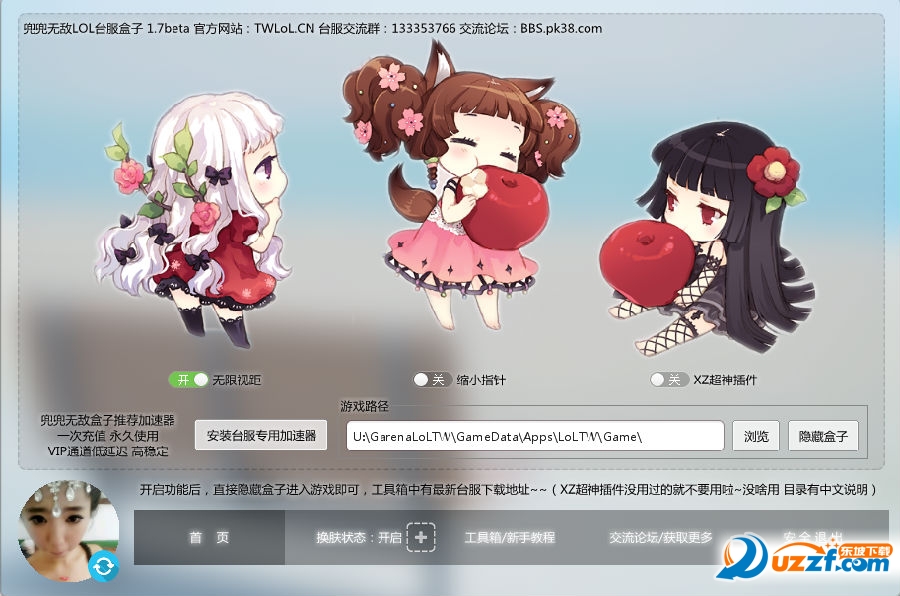 兜兜无敌台服盒子是专为在lol台服的玩家朋友设计的辅助工具,具有一键换肤、无限视距等实用游戏辅助功能,喜欢玩lol的朋友可以来下载使用!