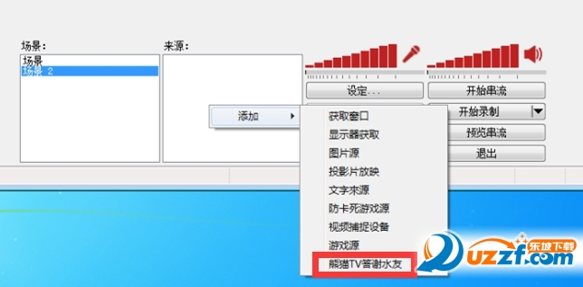 按照上面的步骤安装好插件后,启动OBS, 然后在OBS主界面的“来源”列表窗口里面点鼠标的右键,然后点击弹出来的“添加”,再在里面点击“熊猫TV答谢水友”来添加这个源,