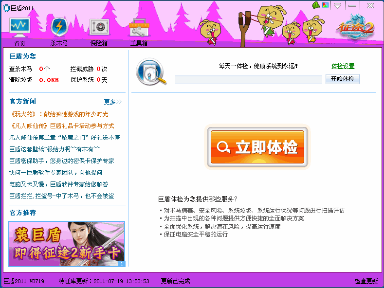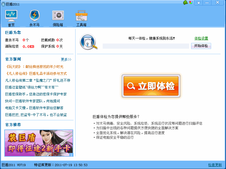 巨盾拥有木马查杀、电脑体检、网游保护、文件清理、系统管理、密保卡保护等多种功能。目前木马威胁之大已远超病毒,巨盾在杀木马、防盗号、保护网银和游戏的帐号密码安全等方面表现出色,有基础的用户可以自己写脚本进行木马查杀,功能强大,扩展性强。