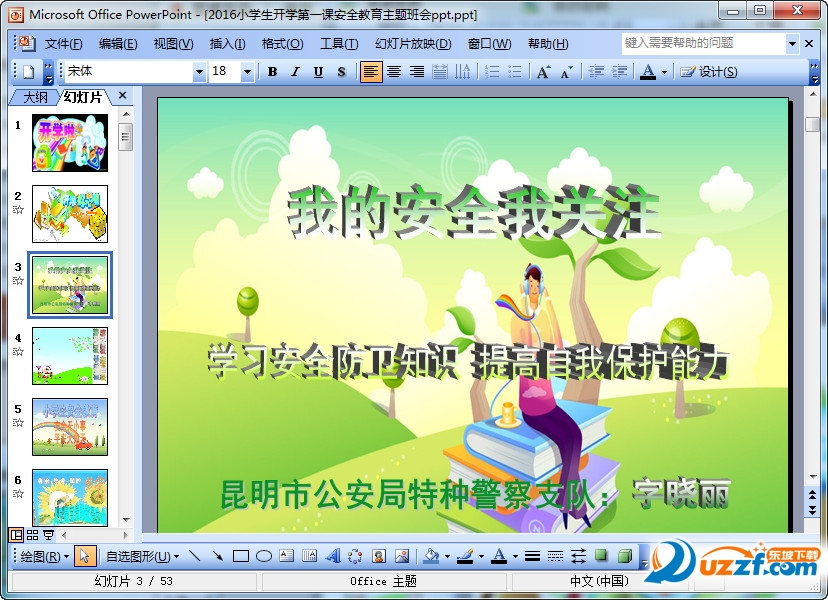 2016年春季开学了,各位同学们在开学的时候还是要注意安全的,毕竟安全无小事,让安全伴我行吧!这份2016小学生开学第一课安全教育主题班会ppt,总共有53页,告诉小朋友们开学了,我的安全我关注,从消防安全、用电安全、课间安全、日常人身安全、交通安全、注意天气等方面的内容出发,学习安全防卫知识,提高孩子们的自我保护能力。