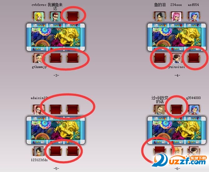 里面稍大的是桌子,外围的是椅子。当有人坐下时,头像代替椅子。您可以直接选择空的椅子,也可以点击房间工具栏上的“加入”按钮自动加入到空椅子。