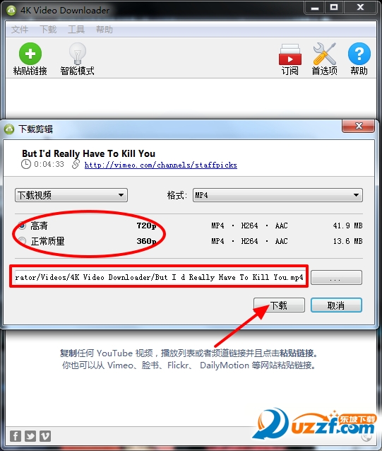 解析成功后会弹出下载选项框,如图:选择视频文件的清晰度、格式以及下载地址,下载地址默认在:C:\Users\Administrator\Videos\4K Video Downloader目录下