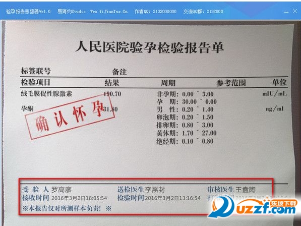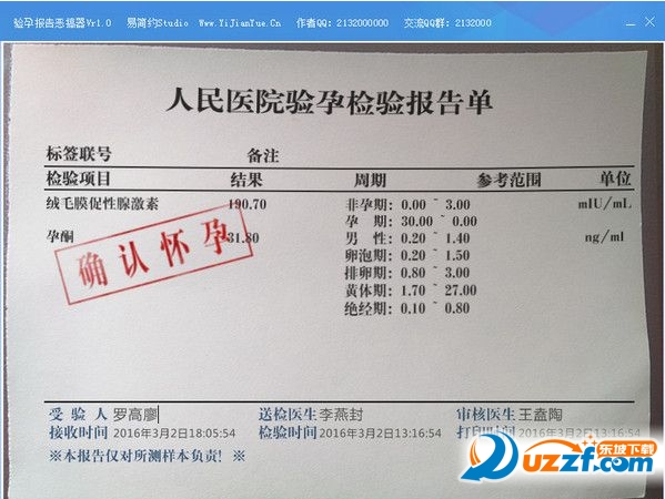 验孕报告恶搞器可以制作一张假的验孕报告图片,发给别人看,分享到朋友圈,微博,震惊你的朋友。可以用来检验你的男朋友是什么态度,也可以试试婆婆的态度!非常的真实有用,操作简单,输入自己的名字就可以了!