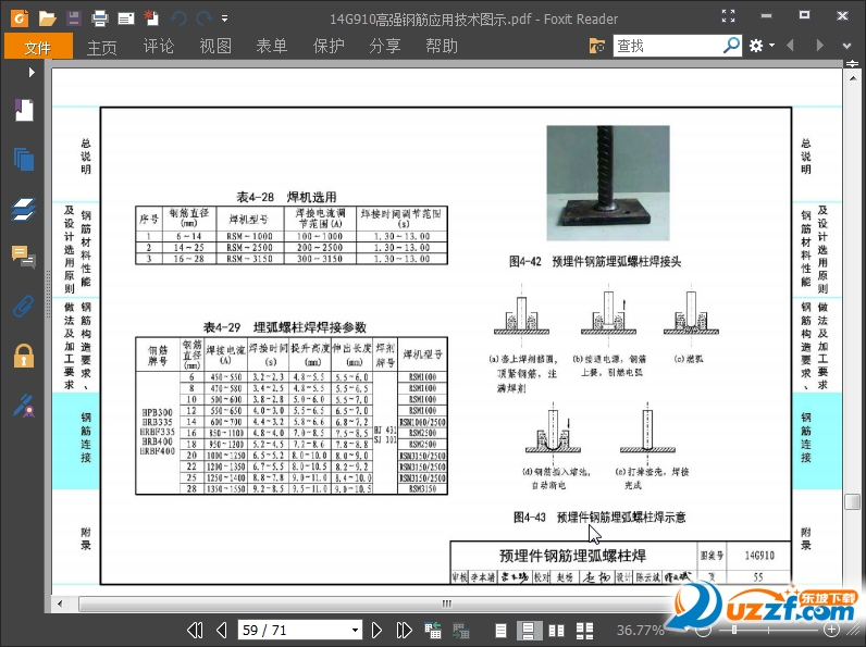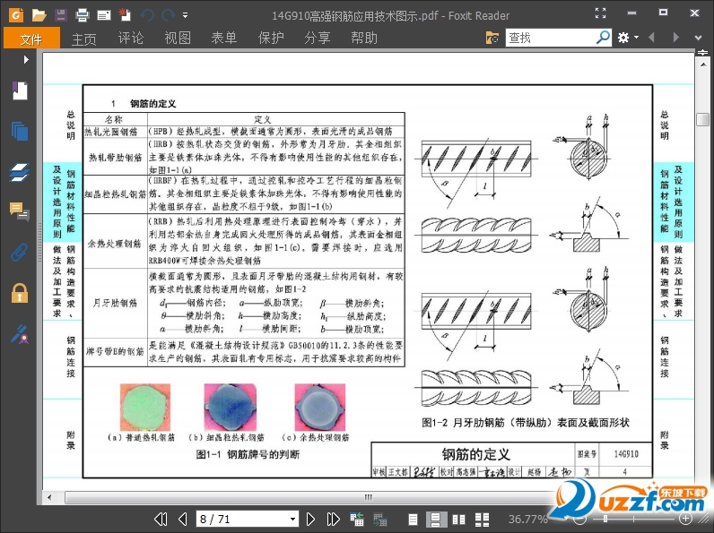 14G910《高强钢筋应用技术图示》国家建筑标准设计图集主要编入了400MPa和500MPa级钢筋,同时适用于400MPa级以下钢筋。内容包括钢筋的材料性能要求;设计基本规定和构造、做法及加工要求;钢筋连接的施工工艺;钢筋连接的施工质量验收要求等。图集将规范中的内容归纳、整理、优化后以表格的形式给出,并配以大量施工工艺图示和实用图片,便于使用者对规范的直观理解、掌握和查找。本图集适用于施工中的钢筋应用,设计人员可参考使用。