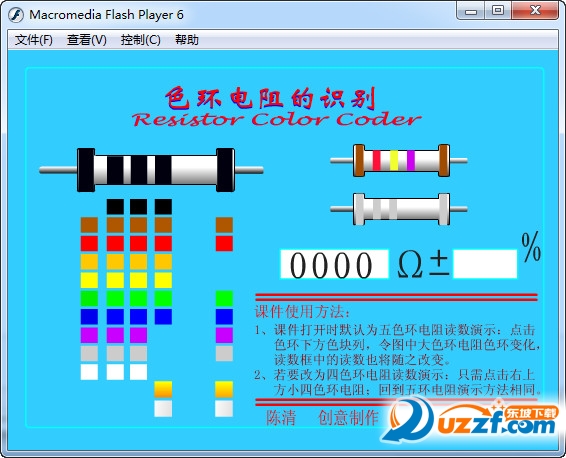 1、课件打开时默认为五色环电阻读数演示:点击色环下方色块列,令图中大色环电阻色环变化,读书框中的读数也将随之改变。