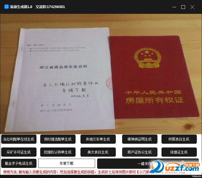 装逼图片生成器可以一键轻松生成各种类型的装逼证书,装逼无罪!软件使用简单,支持生成各类豪车订单、表白生成、房产证生成、结婚证生成,居然还特么有精神病证明,识货不?识货就拿去!