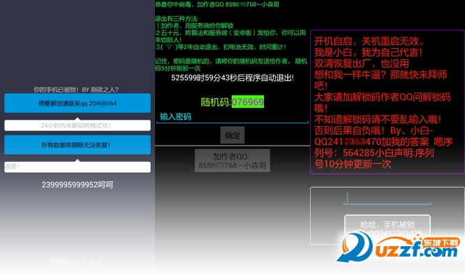 木马安装运行后,会迅速地把手机屏幕用自定义的对话框全部遮盖住,干扰用户正常使用手机,只有按照对话框的提示联系木马作者并付款,才能拿到解锁密码。