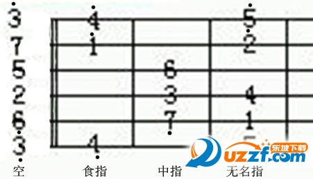 比如C大调的DO(哆)是在吉他5弦的3品,所以在六线谱的5线上写个3