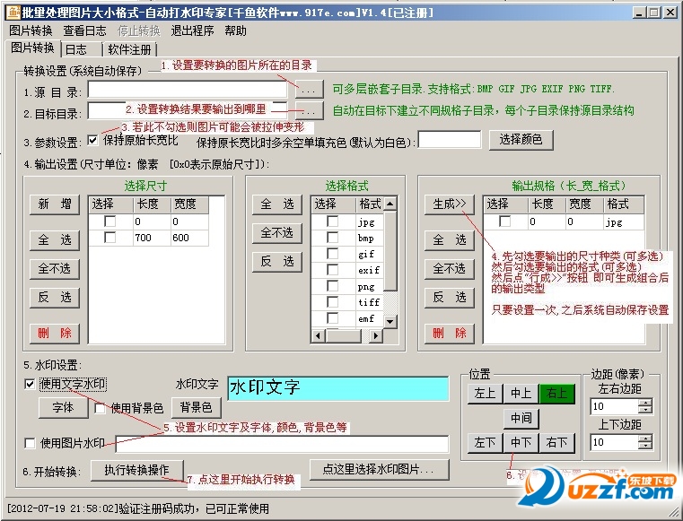 将不同格式不同尺寸大小的图片,按设置的输出格式自动批量处理转换,并可以自动打水印,同一种格式和大小的输出文件放在同一个目录里,管理方便,输出格式可以灵活配置,系统自动保存配置,使用极其方便。