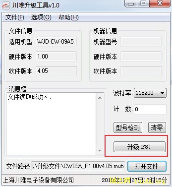 5、此时会显示机器的软硬件版及“文件读取成功”提示,按“升级”按钮即可开始。