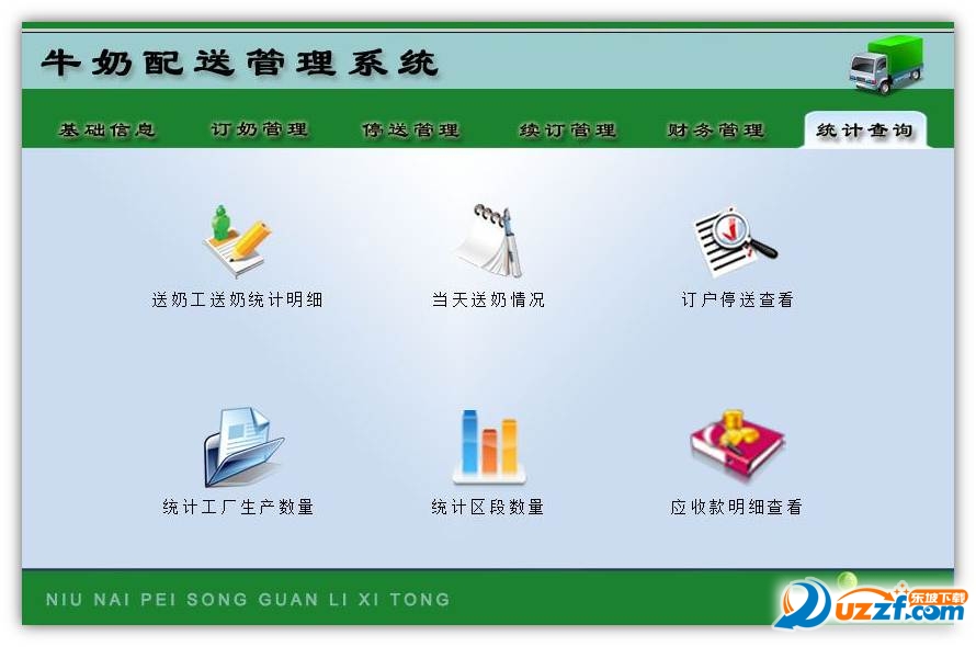 6、 统计查询:送奶工送奶统计明细、当天送奶情况、订户停送查看、统计工厂生产数量、统计区段数量、应收款明 细查看。