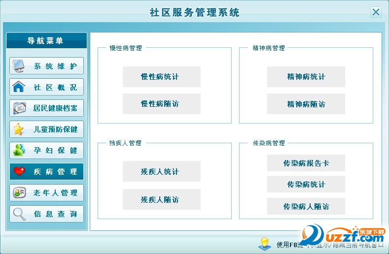 5:疾病管理、自动统计各种疾病的发病率、疾病的跟踪情况、老年人健康档案、老年人健康的跟踪及各模块的信息查询。