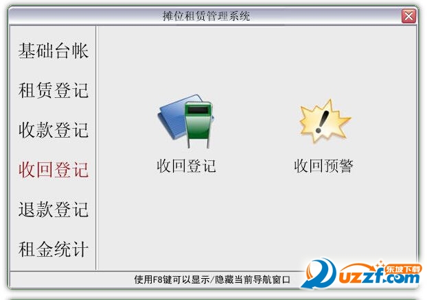 4.收回登记:包括收回登记,收回预警,当前库存明细,主要对摊位收回进行管理。