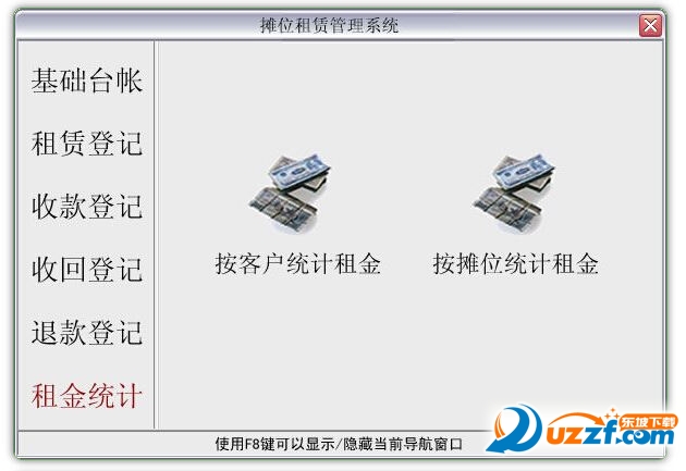 5.退款登记:包括退款登记,主要是对退款押金进行管理。租金统计:包括按客户租金统计、按摊位租金统计。