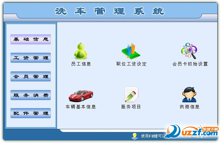 1.基础信息:员工信息,职位工资设定,会员卡初始设置,车辆基本信息,供商信息,服务项目。