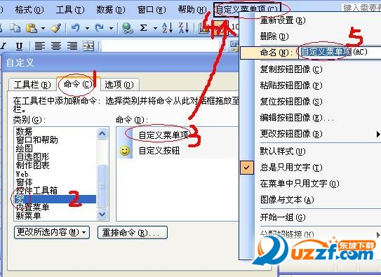 3、点击“工具——自定义——命令”,左侧选宏,右侧选中“自定义菜单项”,并拖至菜单栏,暂时不关闭自定义窗口,右击这个新建的“自定义菜单项”,在弹出的快捷菜单中,把“命名”中的“自定义菜单”改成“公式编辑器”;再选择“指定宏”,选刚才录制的宏,如“Macro1”,按确定即可。