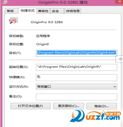 2、在“桌面”或“程序”中找到Origin9.0的图标,鼠标右键点击“属性”,会弹出下图。点击下图中的“打开文件位置(F)”按钮,则会进入Origin9的安装目录。