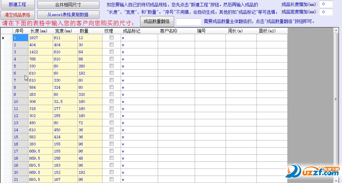 1.输入成品的尺寸、数量等信息